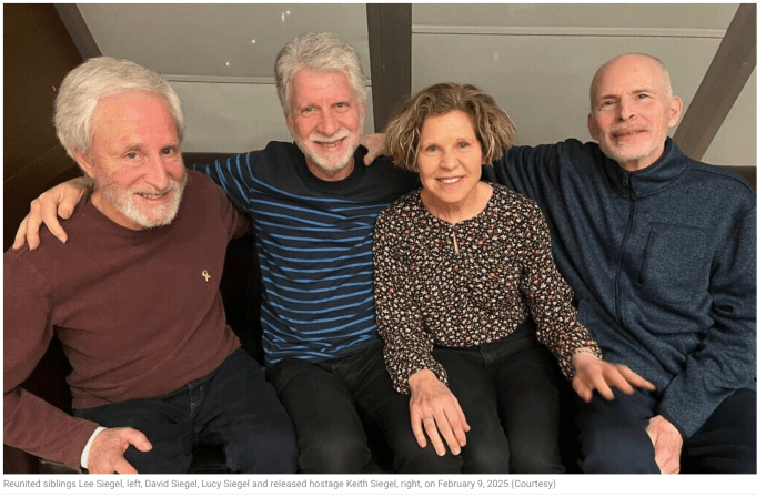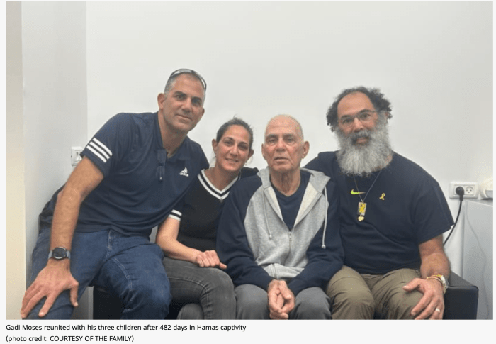 Gadi Moses, 80, wurde am 30. Januar 2025 freigelassen. Während der gesamten Geiselhaft von 480 Tagen hatte er keinen Kontakt zu anderen Geiseln. Der erste Mensch, den er ausser seinen Peinigern sah, war unmittelbar vor der Freilassung, Arbel Yehoud.