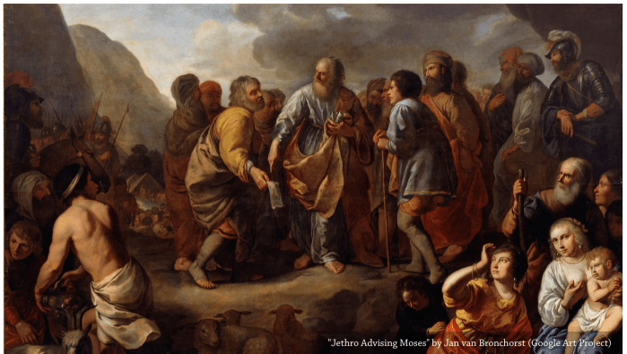 Jitro, der Mann, der gerade erst Gott als den Einzigen erkannt hatte, gab ihm eine Lehrstunde in juristischem Management. Er ist sich sicher, dass Gott seinen Vorschlag gutheissen wird (18:19). Ganz ohne, dass er zunächst ein Gremium bildete, erklärte er, wie Moshe sich eine Gruppe von unbestechlichen Richtern zur Seite stellen konnte.