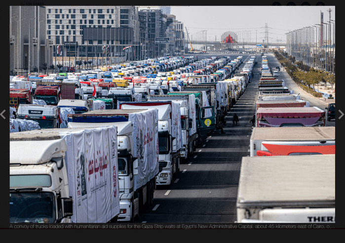Eine nicht enden wollende Schlange von Lkws mit Hilfsgütern und Lebensmitteln für Gaza staut sich im neuen Industrieviertel 45 km östlich von Kairo. Bilder zeigen, dass der Stau sich auf acht Spuren erstreckt. Nachdem der Waren-Grenzübergang Rafah erst wieder instandgesetzt werden muss, werden die Lieferungen derzeit in Kerem Shalom abgefertigt.