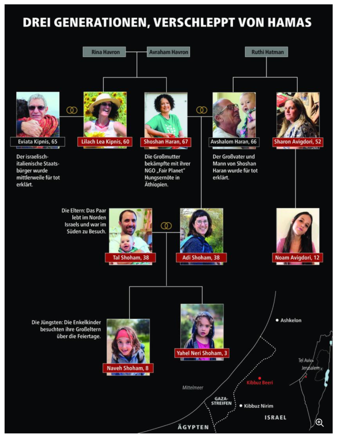 Tal Shoham, 39, ist die einzige Geisel mit österreichisch-israelischer Bürgerschaft. Am 7. Oktober 2023 war er mit seiner Familie bei den Schwiegereltern im Kibbutz Be’eri zu Besuch. Er wurde gemeinsam mit seiner Frau, Adi Shoham, 39 seiner Tochter, Yael, 3, seinem Sohn, Naveh, 8, und seiner Schwiegermutter Shoshan Haran, der Tante seiner Frau Sharon Avigdori sowie deren Tochter Noam, 12, verschleppt. Seine Familie wurde im November 2023 freigelassen. Sein Schwiegervater Avshalom Haran, sowie weitere Verwandte, Eviatar und Lilach Kipnis wurden während des Massakers ermordet. Die Grosseltern von Tal stammen aus Wien und aus Deutschland und wurden Ende der 30er-Jahre von den Nationalsozialisten vertrieben. Einige Familienmitglieder kamen im KZ-Theresienstadt ums Leben. Ihre Nachkommen bauten den Kibbutz Be’eri auf, in dem die Familien auch heute noch leben.