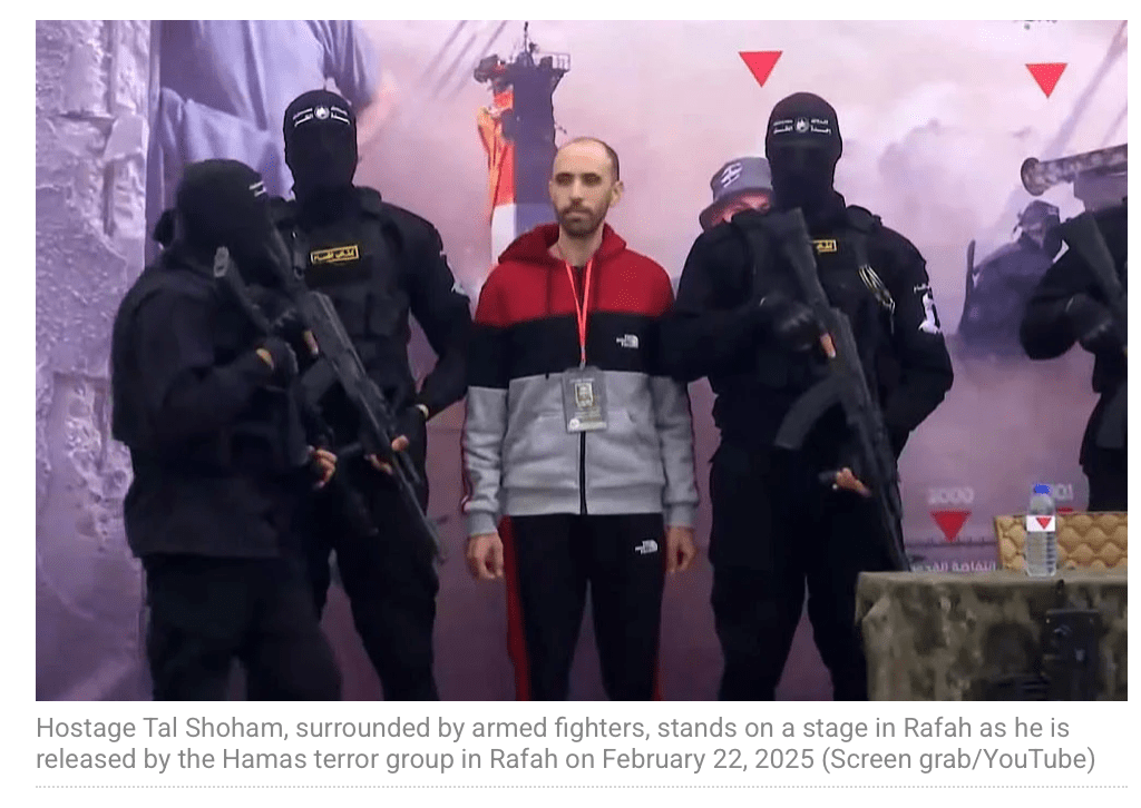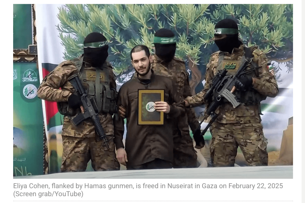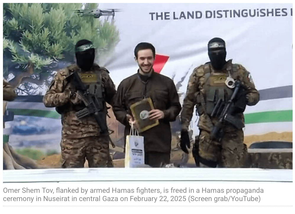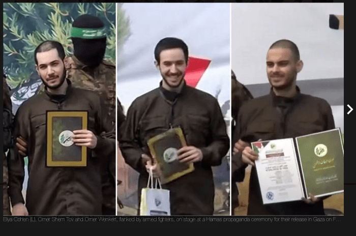 Drei weitere Geiseln, Omer Shem Tov, Eliya Cohen und Omer Wenkert wurden in der Zeremonie im Flüchtlingscamp Nuseirat dem IRK übergeben. Hier standen andere Terroristen mit auf der Bühne, gekleidet in Camouflage-grüne Uniformen. Während Eliya Cohen und Omer Wenkert nur zögerlich der Aufforderung zu winken nachkamen, schien Omer Shem Tov nahezu ausser sich vor Freude zu sein, er winkte fröhlich in die Menge, mehr als das, er zog die Köpfe von zwei Terroristen zu sich herunter und küsste sie auf den Scheitel. Ich kann es nicht glauben, was seine Grossmutter Sara verkündete: «Das ist Omer. Er kommt mit allen klar. Sogar mit der Hamas….. sie haben ihn sogar dort lieb.» Ich glaube viel eher, dass seine zur Schau getragene Fröhlichkeit Teil der grausamen und sadistischen PR ist und dass hier irgendwelche Psychopharmaka nachgeholfen haben. Es kann auch sein, dass sich ein Abwehrmechanismus zeigt, bei der der Entführte versucht, mit dem Trauma klarzukommen, indem er eine Pseudo-Verbindung zu seinem Peiniger aufbaut.