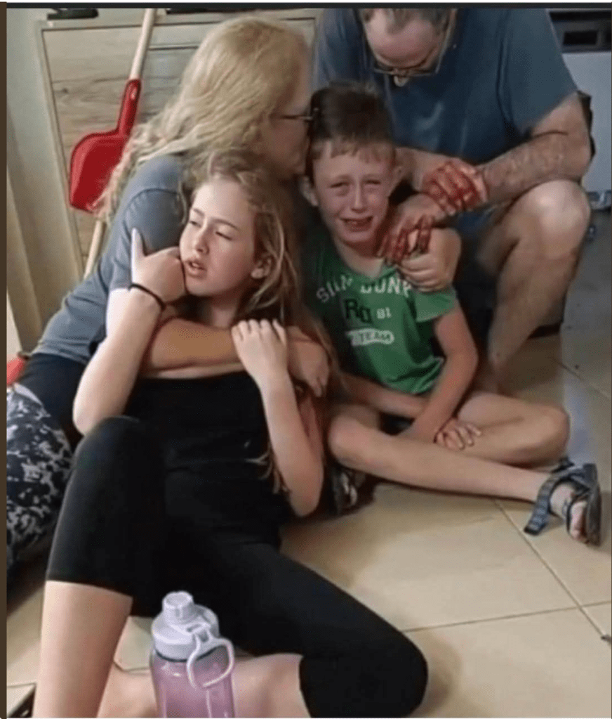 Ohad Yahalomi, 49, s’’l, ein weiterer Bewohner von Niz Oz, wurde bei der Verteidigung seines Schutzraumes in ein Feuergefecht mit den Terroristen verwickelt und ins Bein geschossen. Seine Frau Batsheva sowie ihre drei Kinder wurden zusammen mit einem Gastarbeiter auf zwei Motorrädern von bewaffneten Terroristen verschleppt. Irgendwann gelang es Batsheva und ihren beiden Töchtern in Pyjamas und Flip-Flops drei Stunden nach Hause zu rennen und in den nördlichen, kaum beschädigten Teil des Kibbutz zu gelangen. Sie waren sicher, Ohad dort vorzufinden und wurden bitter enttäuscht. Ihr Sohn, 12, wurde im November 2023 freigelassen. Er wurde in der Geiselhaft alleingelassen und von Zivilisten misshandelt. Die Terroristen zwangen ihn, Filme anzuschauen, die sie während des Massakers aufgenommen hatten. Eitan war als lustiges Kind entführt worden und kam als völlig verstörtes, traumatisiertes Kind zurück.
