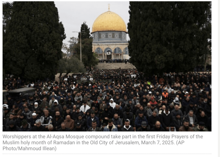 Zehntausende Muslims haben sich zu den ersten Freitagsgebeten während des Ramadans auf dem Tempelberg eingefunden. Die jordanische Waqf, die die Oberaufsicht über das Gebiet hat, sprach sogar von bis zu 90.000 Betern. Aus Sicherheitsgründen war, wie bereits in den vergangenen Jahren, der Zutritt für Kinder nur bis 12 Jahre und Männer ab 55 Jahren erlaubt, Frauen mussten älter als 50 Jahre sein. Die Sicherheitskräfte in und um die Altstadt wurden verstärkt. Insgesamt machen aktuell 3.000 Polizisten Dienst in ganz Jerusalem
