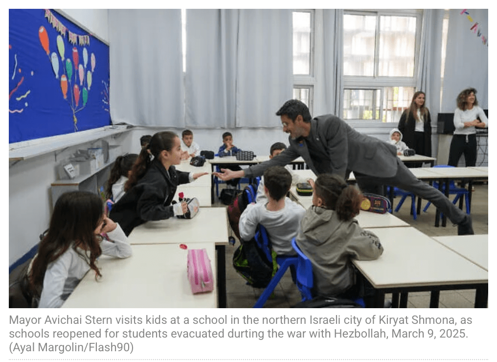 In Kiryat Shmona, wo heute ebenfalls die Schule wieder begann, kam es zu einem undurchschaubaren Zwischenfall. Bildungsminister Yoav Kisch, Likud, sass im Lehrerzimmer der Schule, vor der Türe der Schule standen Wachen. Pe’er Laredo, Vater einer Schülerin und enger Berater von BM Avichai Stern, wollte mit Kirsch nach eigenen Angaben über noch bestehende Sicherheitsrisiken in den Schulen sprechen. Er wurde aber von den Wachen in einen ’körperlichen Konflikt’ verwickelt und festgenommen. «Nach anderthalb Jahren der Evakuierung aus unseren Häusern bin ich gekommen, um die Kinder willkommen zu heissen und mein Kind wieder zur Schule zu bringen. Es ist verrückt, dass ich mich auf der Polizeistation wiederfinde. Minister Kisch kam, um ein Band zu durchschneiden und die politische Inszenierung fortzusetzen. Er hat vergessen, dass die Wahlsaison vorbei ist.» BM Stern konnte sich bei den verspäteten Wahlen gegen den vom Likud bevorzugten Kandidaten Eli Zafrani durchsetzen. Er lehnte den Besuch des Bildungsministers als ‘billigen PR-Gag ab’. Das Büro von Kisch behauptet, das Bildungsministerium habe versucht, in Zusammenarbeit mit der Stadtverwaltung eine Führung durch Kiryat Shmona zu organisieren, sei jedoch wiederholt abgewiesen worden. In der Erklärung wird Stern ausserdem vorgeworfen, «Schläger auf den Minister angesetzt zu haben, die von Shin-Bet-Sicherheitskräften festgenommen wurden.»