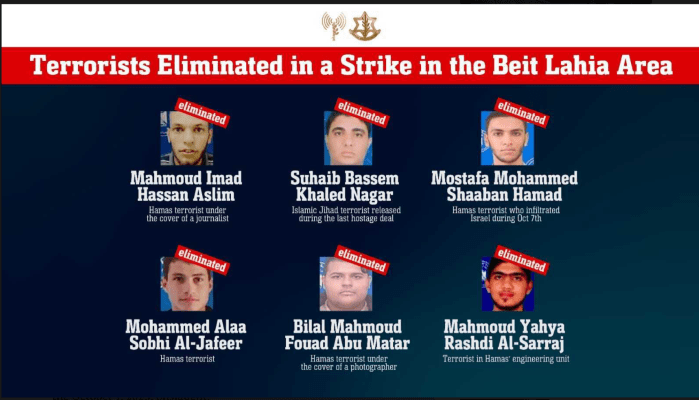Die IDF gab heute die Namen der sechs Hamas-Terroristen bekannt, die gestern bei Luftangriffen in der Region von Beit Lahiya eliminiert wurden. Einer von ihnen hat nachweislich aktiv am Massaker vom 7. Oktober 2023 teilgenommen. Einige der Terroristen waren als Journalisten getarnt, ein weiterer war erst vor wenigen Wochen im Rahmen der Freilassung von Gefangenen nach Gaza ausgeliefert worden.