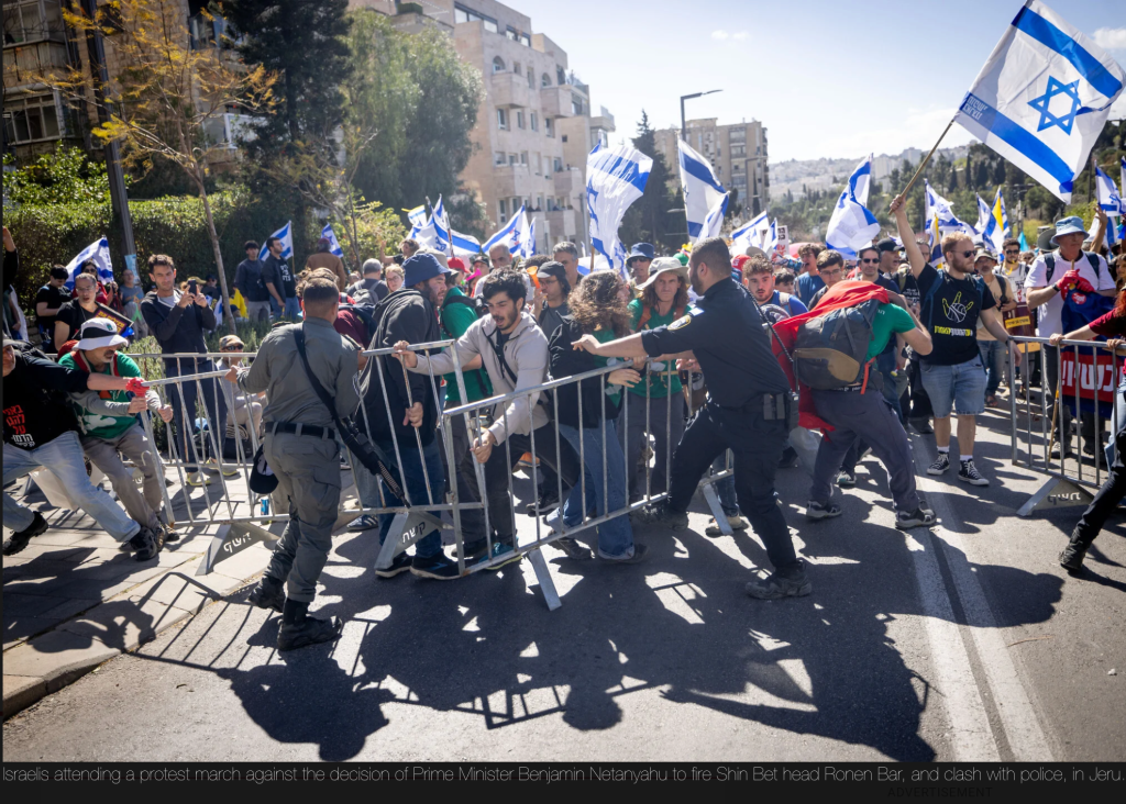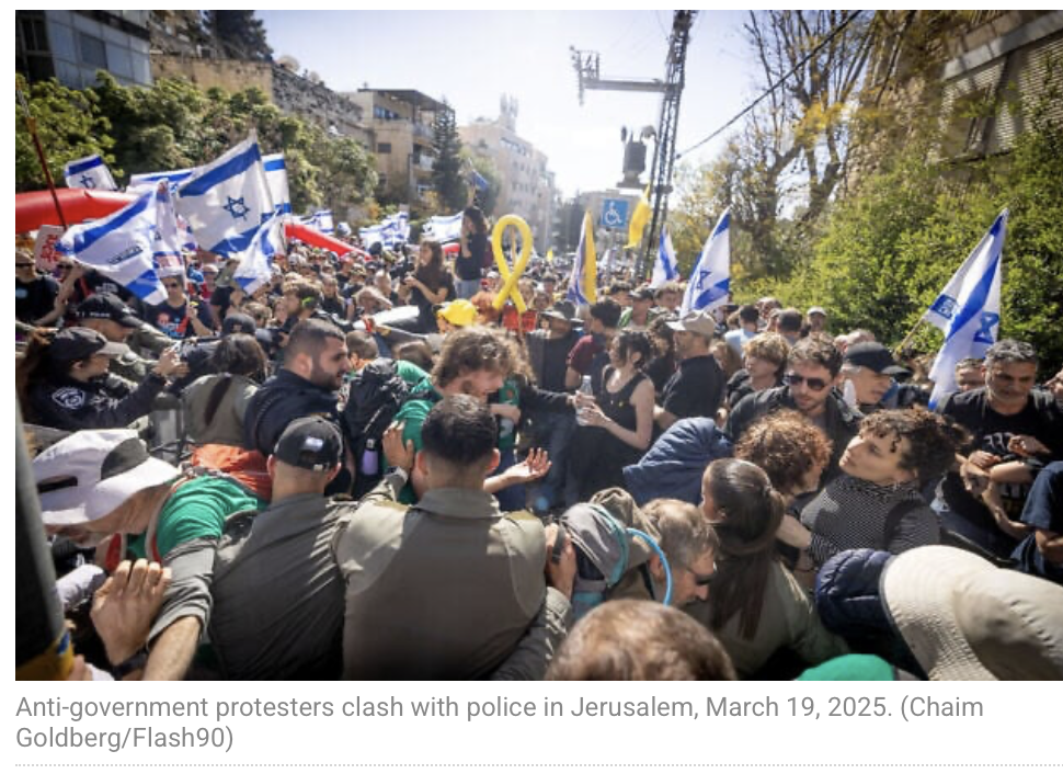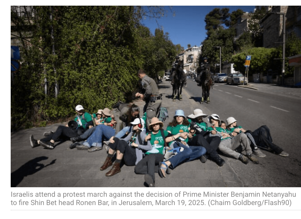 Einige Tausend Demonstranten haben sich auf den Weg von der Knesset zum privaten Haus des PM gemacht, um dort gegen die von ihm geplante Entlassung von Shin-Bet Chef Ronen Bar zu demonstrieren. Als neuer zweiter Grund der aufgebrachten Demonstranten erweist sich der wieder aufgeflammte Krieg gegen die Hamas. Die Demonstranten tragen grosse Banner mit sich, auf denen steht: «Wir haben genug von der destruktiven Regierung» und «Warum ist er hier und sie [die Geiseln] sind nicht hier?» Am späten Nachmittag gab die Polizei bekannt, dass bisher vier Personen festgenommen wurden, darunter ein bewaffneter ‘Gegendemonstrant’, der damit drohte, Demonstranten anzugreifen. Ein bekannter Demonstrant erklärte: «Wir haben Haman überlebt, wir haben Pharao überlebt, wir haben das Britische Mandat überlebt, wir haben Hitler überlebt, wir werden auch euch überleben. Wir wollen nicht, dass Netanyahu auch nur ein Haar gekrümmt wird, wir wollen nur, dass er aus dem Kabinett fliegt und bis zu seinem letzten Tag im Gefängnis sitzt.» Nach einer Befragung durch die Polizei entschuldigte er sich für den Vergleich Netanyahus mit Hitler. Der Vergleich ist nicht geeignet.