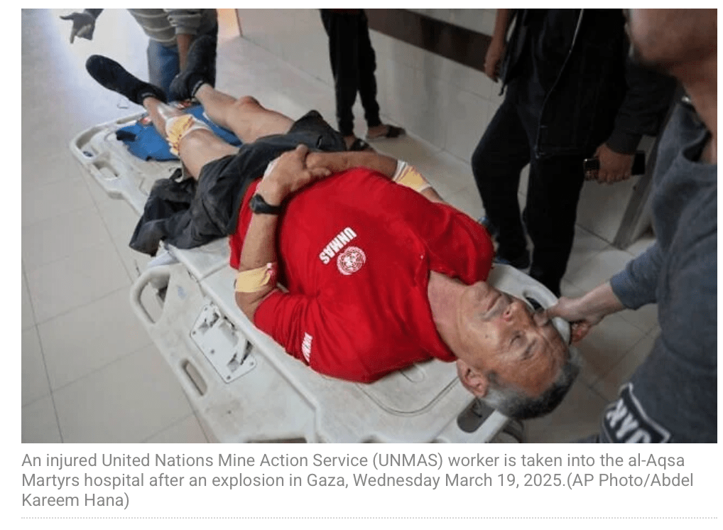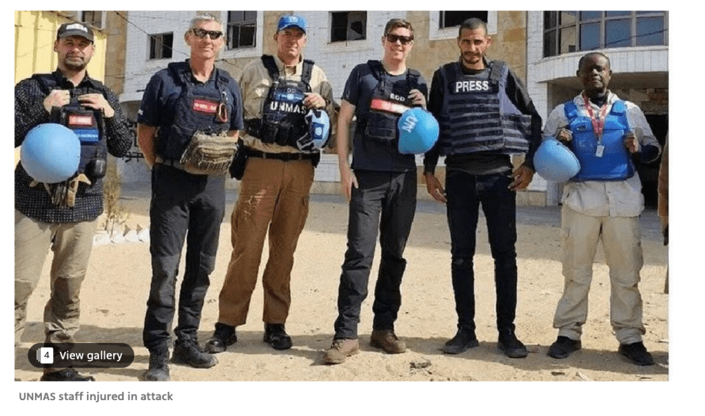 In einer Einrichtung der UN kam es heute zu einem tödlichen Zwischenfall. Fotos zeigen, dass Mitarbeiter der ‘UN Mine Action Service’ vor Ort arbeiteten, als eine Mine explodierte. Zwei ausländische Mitarbeiter wurden dabei getötet, einige andere verletzt. Die Hamas war trotzdem schnell dabei, Israel anzuklagen, einen Luftangriff ausgeführt zu haben. Das wurde von der IDF ohne weitere Kommentare abgewiesen.