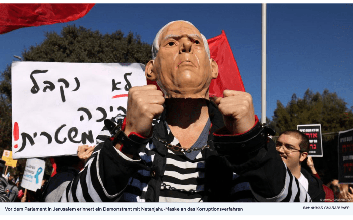 Vor der Knesset demonstrierten aufgebrachte Bürger, ein beliebtes Sujet war schon damals: Netanyahu in Ketten.