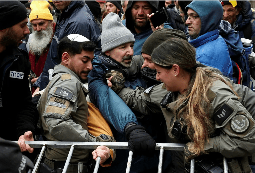Die letzten Tage zeigten neue Rekorde bei den Anti-Regierungs- und Anti-Kriegs-Demonstrationen. Am Dienstag zeigte sich die grausame alt-neue Fratze der Sicherheitskräfte, die der Befehlsgewalt des gerade retablierten rechtsextremen Ben-Gvir unterstehen. Bei friedlichen Demonstrationen auf dem Vorplatz eines Einkaufszentrums tobten sich teilweise maskierte Einheiten von Polizei und Grenzpolizei so unglaublich gewaltsam aus, wie man es bisher noch nicht gesehen hatte. Sie schlugen und traten auf schon am Boden liegende ein, es gab zahlreiche Verletzte und Knochenbrüche. Ein Offizier, der gebeten wurde, sich auszuweisen weil er kein Namensschild hatte, sagte: «Du willst, dass ich mich ausweise? Du bist mir scheissegal. Ben-Gvir ist wieder da, Ihr seid alle erledigt.»
