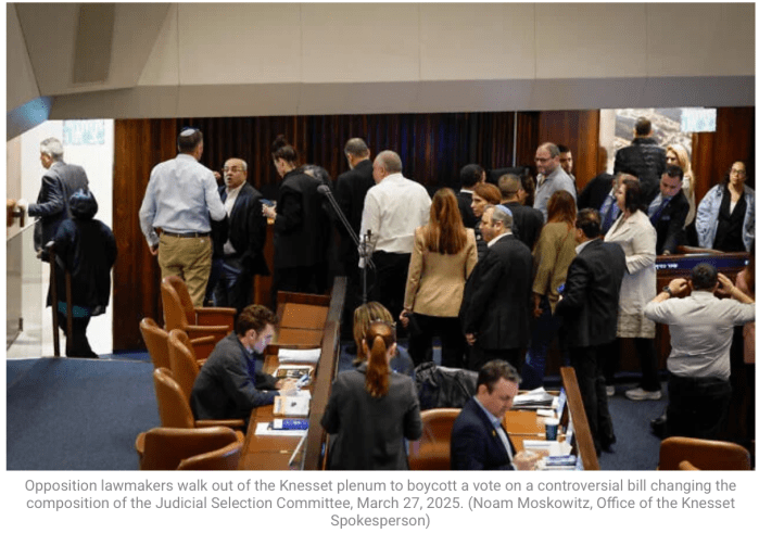 Erneut hat die Regierung einen Schritt Richtung Abschaffung der Gewaltenteilung gemacht. In der langen Nacht in der Knesset waren teilweise hochinteressante Argumente der Opposition gegen das anhängige Gesetz, das Abkommen zur Geiselfreilassung, des endgültigen Waffenstillstands und zum grotesk aufgeblähten, erst gestern Vormittag verabschiedeten Budget zu hören. Leider zumeist vor völlig leerem Haus. Heute wurde das Gesetz zur Zusammensetzung des Richter-Wahl-Gremiums mit 67:1 Stimmen verabschiedet. Gottseidank wird das Gesetz erst nach den nächsten Wahlen, die für Herbst 2026 geplant sind, in Kraft treten. Sofort wurden zahlreiche Petitionen am OGH gegen das Gesetz eingebracht.