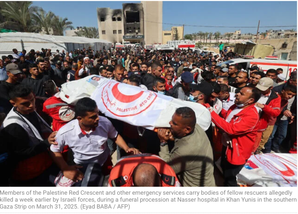 Am Montag wurden 15 Leichen von Mitarbeitern des Roten Halbmonds, der UN und der zu Hamas gehörenden ‘Zivilschutzes’ in einem Massengrab im Sand im südlichen Gazastreifen aufgefunden. Tom Fletcher von der UNO klagte sofort Israel an: «Die Leichen wurden in der Nähe von zerstörten und gut markierten Fahrzeugen begraben. Sie wurden von israelischen Streitkräften getötet, als sie versuchten, Leben zu retten. Wir fordern Antworten und Gerechtigkeit.» Am Freitag hatte die IDF eingeräumt, auf Krankenwagen und Feuerwehrfahrzeuge geschossen zu haben, die sich ihnen in verdächtiger Weise näherten. Jedoch hätten sie keinesfalls willkürlich einen Krankenwagen angegriffen. «Letzten Sonntag wurden mehrere unkoordinierte Fahrzeuge identifiziert, die sich verdächtig auf IDF-Truppen zubewegten, ohne Scheinwerfer oder Notsignale. IDF-Truppen eröffneten daraufhin das Feuer auf die verdächtigen Fahrzeuge. Zuvor an diesem Tag wurden Autos, die nicht Terroristen gehörten, koordiniert und passierten sicher dieselbe Route», sagte der internationale Sprecher der IDF. «Bei dem Vorfall wurden Mohammad Amin Ibrahim Shubaki und achte weitere Terroristen, die am Massaker vom 7. Oktober beteiligt waren, neutralisiert. Ihre Leichen wurden von der IDF in Absprache mit internationalen Organisationen evakuiert.» UNWRA-Chef Lazzarini empörte sich, dass «die Leichen ‘in flachen Gräbern verscharrt wurden’ – eine schwerwiegende Verletzung der Menschenwürde.» Die Untersuchungen sind noch im Gang. Ich hoffe, dass die Untersuchungen zu echten Ergebnissen führen, die anschliessend veröffentlicht werden.