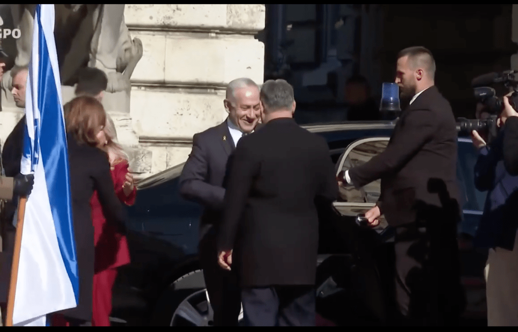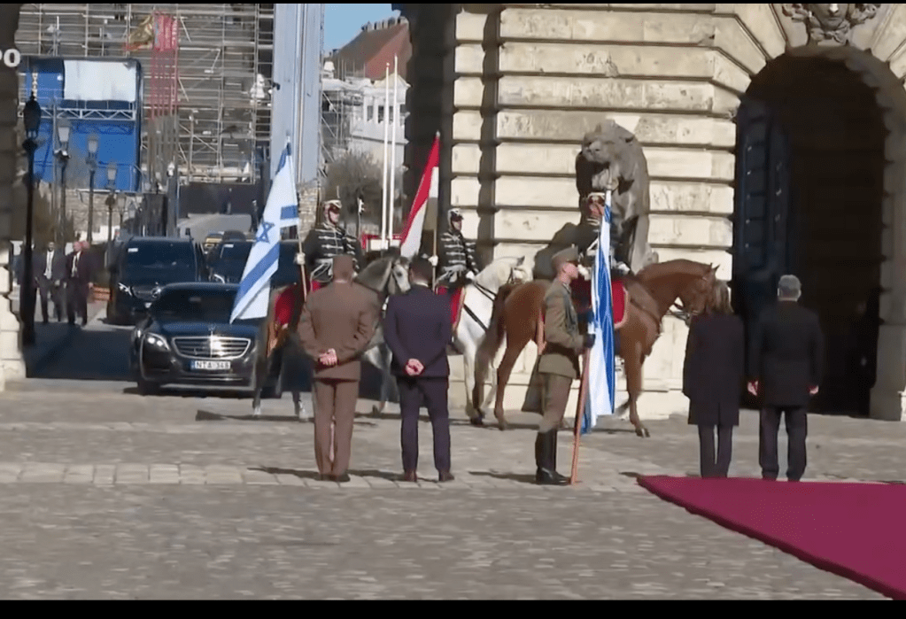 In Budapest wurde Netanyahu mit militärischen Ehren von PM Victor Orban empfangen. Berittene Truppen in traditioneller ungarischer Tracht standen im Innenhof der Burg Buda bereit, als Netanyahu und Sara N. das Fahrzeug verliessen. Die beiden PM plauderten miteinander, während die Ehrenformation abritt und sie sich zu ihrem Gespräch in das Innere der Burg zurückzogen. Kurz vor dem offiziellen Beginn des Besuches der Netanyahus in Ungarn gab der Sprecher des ungarischen PM, Zoltan Kovacs, bekannt, dass sich Ungarn aus dem ICC zurückziehen wird. Mit dem entsprechenden Prozedere wird heute begonnen.