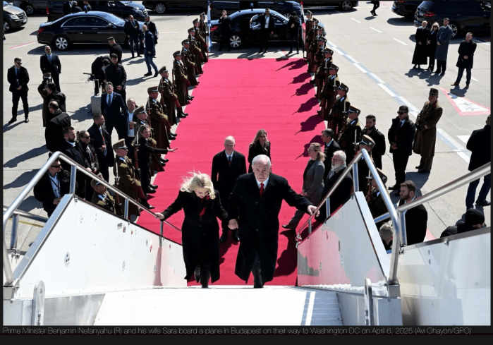 Gegen Mittag verabschiedeten sich Netanyahu und Sara N. aus Budapest. Auf der Flugzeugtreppe wandte Netanyahu den Blick nach oben, als suche er Beistand aus dem Himmel, Sara N. mit Blick nach unten, um nicht den Boden unter den Füssen zu verlieren. Beides werden sie in den kommenden Tagen brauchen. Netanyahu betont in seinem Schluss-Statement: «Ich werde morgen mit US-Präsident Donald Trump die Freilassung der Geiseln, den Abschluss des Sieges in Gaza und natürlich das Zollregime, das auch Israel auferlegt wurde, besprechen. Ich hoffe, dass ich in dieser Angelegenheit helfen kann. Das ist meine Absicht.» Er stellt fest, dass er der erste Staats- und Regierungschef der Welt ist, der sich persönlich mit Trump zu Gesprächen über die Zölle trifft, und sagt: «Dies spiegelt unsere besondere persönliche Verbindung und die besondere Verbindung zwischen den Vereinigten Staaten und Israel wider, die in dieser Zeit so wichtig ist.»