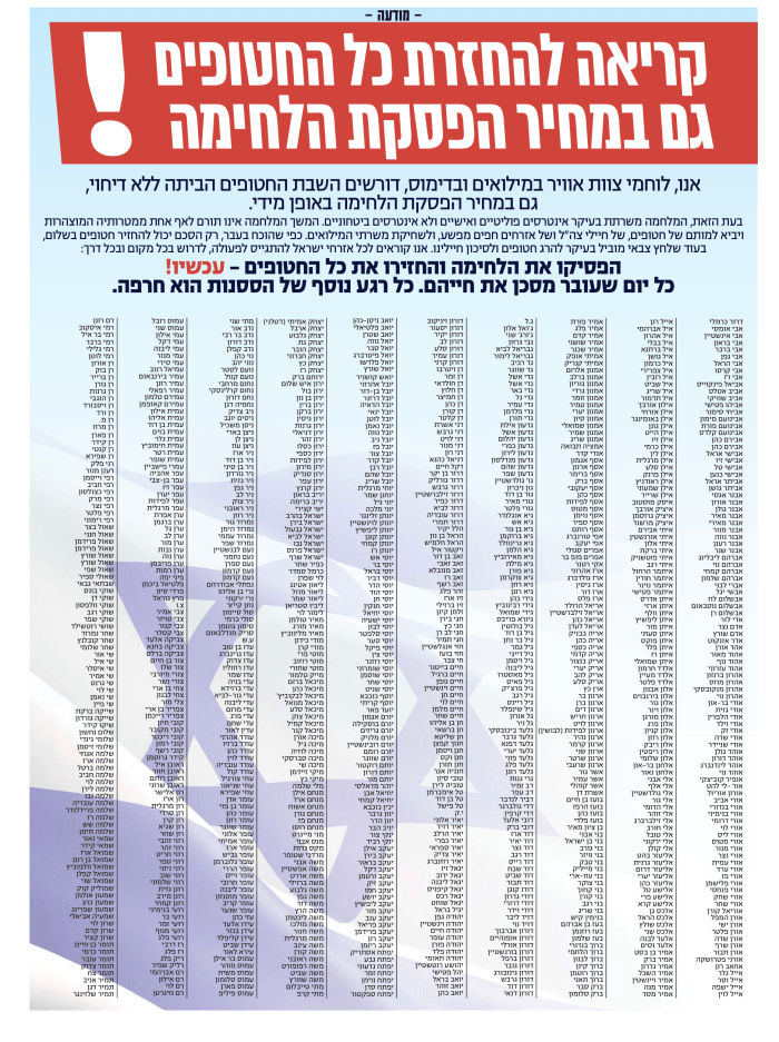Etwa 1.000 aktive und pensionierte Luftwaffen-Reservisten haben einen Brief unterschrieben. Darin fordern sie, dass die Befreiung der noch in Gaza festgehaltenen Geiseln die Priorität gegenüber dem völligen Erreichen der Kriegsziele haben muss. Vorerst hiess es, dass das Schreiben zur Dienstverweigerung aufruft, weshalb IAF-Chef Tomer Bar das Schreiben zunächst zurückhielt. «Die Fortsetzung des Krieges bringt keines der erklärten Kriegsziele voran und wird zum Tod der Geiseln, der IDF-Soldaten und unschuldiger Zivilisten führen», heisst es in dem Brief, der als Anzeige in mehreren israelischen Zeitungen veröffentlicht wurde. «Wie sich in der Vergangenheit gezeigt hat, können Geiseln nur durch eine Einigung sicher zurückgebracht werden, während militärischer Druck hauptsächlich dazu führt, dass Geiseln getötet werden und unsere Soldaten in Gefahr geraten», heisst es weiter. «Wir rufen alle Bürger Israels auf, sich für Massnahmen zu engagieren.» Diese Aussage steht im totalen Gegensatz zur Haltung der Regierung, die eine Verschärfung des militärischen Drucks als einzige Methode ansieht, die Geiseln zu befreien.