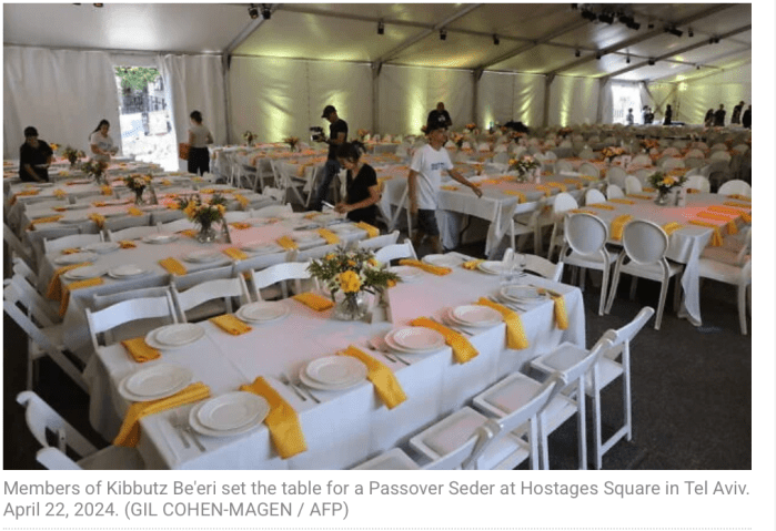 Auf dem Platz der Geiseln in Tel Aviv wird morgen Abend ein gemeinsamer Seder organisiert. Die Öffentlichkeit wird eingeladen, daran teilzunehmen. Der Seder beginnt um 19 Uhr. «Wie können wir an der Seder-Tafel sitzen und die Geschichte unserer Befreiung aus der Sklaverei erzählen, wenn noch immer 59 unserer Brüder und Schwestern als Geiseln von der Hamas festgehalten werden?», fragt einer der Organisatoren. «Während des Seders lesen wir den Vers ‘In jeder Generation muss man sich so sehen, als habe man selbst Ägypten verlassen. Die Bedeutung ändert sich, nachdem man in Geiselhaft gelebt hat», erzählt Karina Ariev, die im Januar befreit wurde. «Obwohl ich hier bin, ist mein Herz noch dort. Dort sind noch 59 Geiseln, die auf ihr ‘Fest der Freiheit’ warten, die darauf warten, nach Hause zu kommen.»