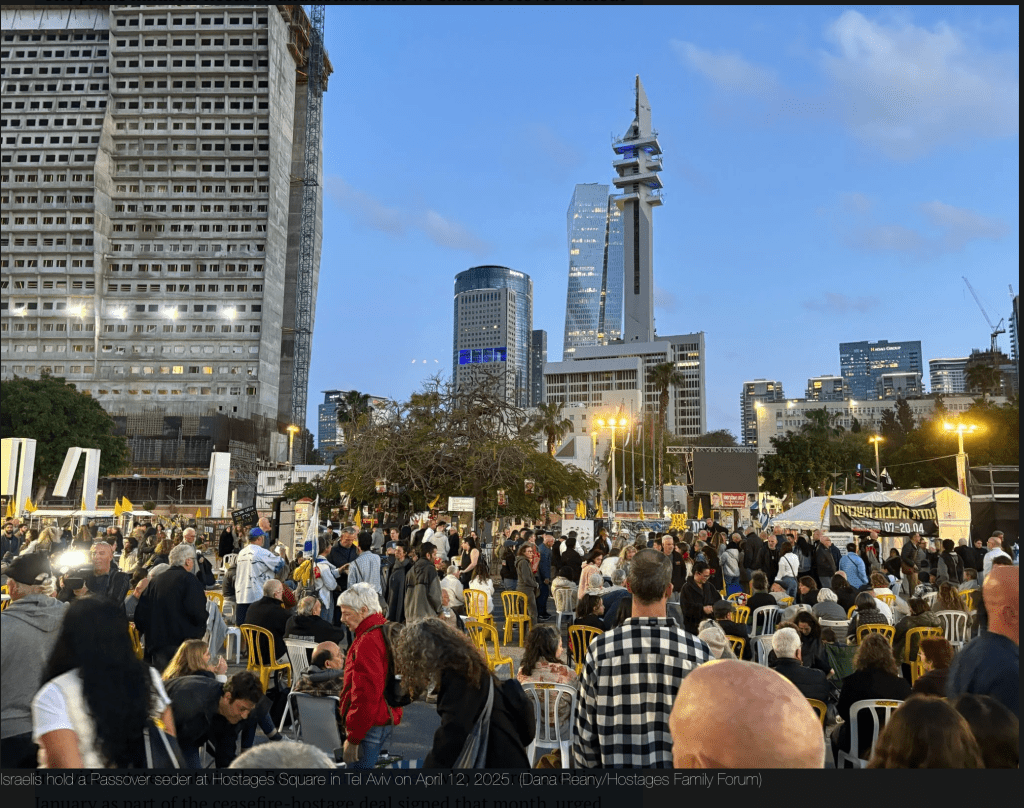 Auf dem Platz der Geiseln in Tel Aviv begingen Familien und Freunde der noch in Gaza festgehaltenen Geiseln einen gemeinsamen Seder. Die Öffentlichkeit wurde eingeladen, am Seder teilzunehmen. «Bringen Sie Ihr Feiertagsessen mit, bringen Sie eine Matte oder einen Stuhl mit, kommen Sie mit den Kindern, kommen Sie mit Freunden – lassen Sie uns zusammen sein», hiess es. Zahlreiche Tel Avivis folgten ebenso der Einladung, wie Angehörige der freigelassenen Geiseln. Mit der Forderung ’59 or resign’ (das Wortspiel funktioniert nur in Englisch) forderten sie den von Netanyahu neu ernannten Chef des Verhandlungsteams, Minister Ron Dermer auf, die Verhandlungen wieder in Gang zu bringen. Für die kommenden Tage kündigte das Forum an, Gedenkveranstaltungen auf dem Platz der Geiseln durchzuführen.