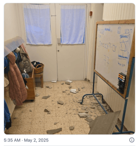 Die Houthi-Terroristen reklamierten für sich den erfolgreichen Angriff auf die Luftwaffen-Basis ‘Ramat David’ südöstlich von Haifa. Durch die heranfliegende Rakete wurde der Alarm im Grossraum Haifa ausgelöst. Die Rakete wurde jedoch frühzeitig vor dem Erreichen des israelischen Luftraums abgefangen. Schrottteile der abgefangenen Rakete schlugen in den Kindergarten des Kibbutz Mishma Ha’emek ein. Nachdem der Einschlag jedoch am frühen Morgen erfolgte, befand sich niemand im Gebäude, sodass nur Sachschaden entstand. Eine zweite Rakete wurde am Nachmittag von den Houthis in Richtung Haifa abgeschossen und löste erneut den Alarm aus. Die Rakete wurde ebenfalls abgefangen, bevor sie den israelischen Luftraum erreichte.