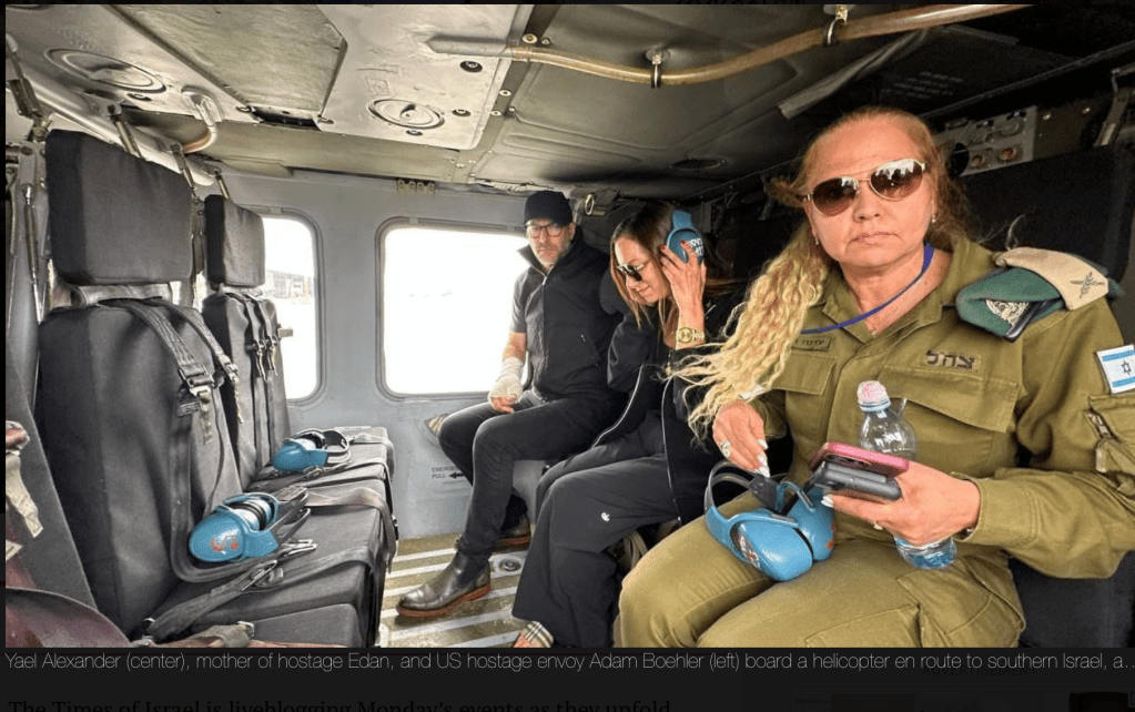 Gegen 19:30 Ortszeit wurde Eden Alexander in Gaza dem Roten Kreuz übergeben. Ein Photo zeigt ihn mir der bekannten Mitarbeiterin des RK, flankiert von drei Hamas-Terroristen. Er kann ohne Hilfe stehen und sieht für mein Empfinden besser aus, als auf dem Video von Mitte April.