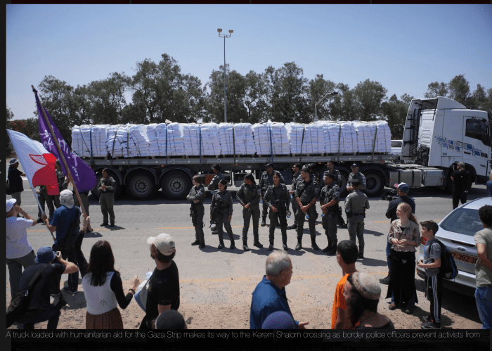 Die extrem-rechte Gruppe ‘Tzav 9’ und die Reservisten-Gruppe ‘Generation of Victory’ versuchen seit heute Morgen, die Lkws, die Hilfslieferungen und Lebensmittel in den Gazastreifen bringen sollen, zu behindern. Auf einem von ihnen in den sozialen Medien verbreiteten Video ist zu sehen, wie die Aktivisten langsam vor den Lkws hergehen und sie damit zwingen, in weniger als Schritt-Tempo zu fahren. Ein Aktivist wurde verhaftet, als er versuchte, die Strasse zu blockieren, ein zweiter, als er den Anweisungen der Polizei nicht folgte und sie an der Ausübung ihrer Pflicht hinderte. Da kann ich nur sagen: ‘Pfui!!!’