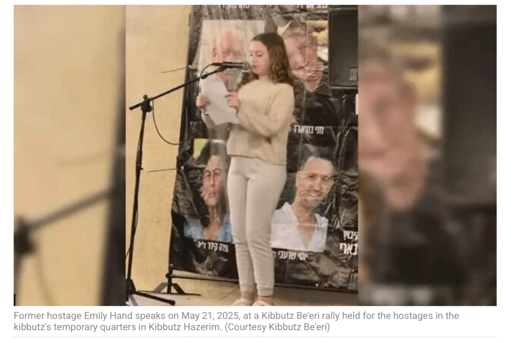 Emily Hand, 11, war bei ihrer Verschleppung nach Gaza erst acht Jahre alt. Sie wurde zusammen mit ihrer Freundin Hila Rotem Shoshani, 14, und deren Mutter Raaya Rotem, 54, aus deren Haus im Kibbutz Be’eri verschleppt. Alle drei wurden im Zuge des ersten Waffenstillstands im November 2023 freigelassen. Nach ihrer Freilassung konnte Emily wochenlang nicht laut sprechen, zu tief sass das Trauma ihrer Gefangenschaft. Die Terroristen hatten angeordnet, dass sie nur flüstern dürfe. Heute, mehr als 500 Tage später und auch dank der liebevollen Betreuung durch ihren Vater Thomas, hat sie ihre Stimme wiedergefunden. «Bibi, ich spreche direkt zu dir – schliesse jetzt ein Abkommen, denn so kann es nicht weitergehen», sagt sie. «Und ich möchte dir sagen: Die Bedingungen dort sind hart. Wir müssen alle zurückholen!» Emily erzählt weiter: «Den Kühlschrank zu öffnen, ist ein Privileg. In einem Bett schlafen zu können, ist ein Privileg. An diesem schwarzen Samstag hatte ich Pläne, mich mit Freunden zu treffen, mit meiner Schwester im Studio zu tanzen, zu kochen. Aber nein. Das ist nicht passiert, denn stattdessen bekam ich eine Einbahnfahrkarte nach Gaza.» Emily verlor ihre Mutter, als sie zwei Jahre alt war, die zweite Frau ihres Vaters wurde am 7. Oktober von der Hamas ermordet.