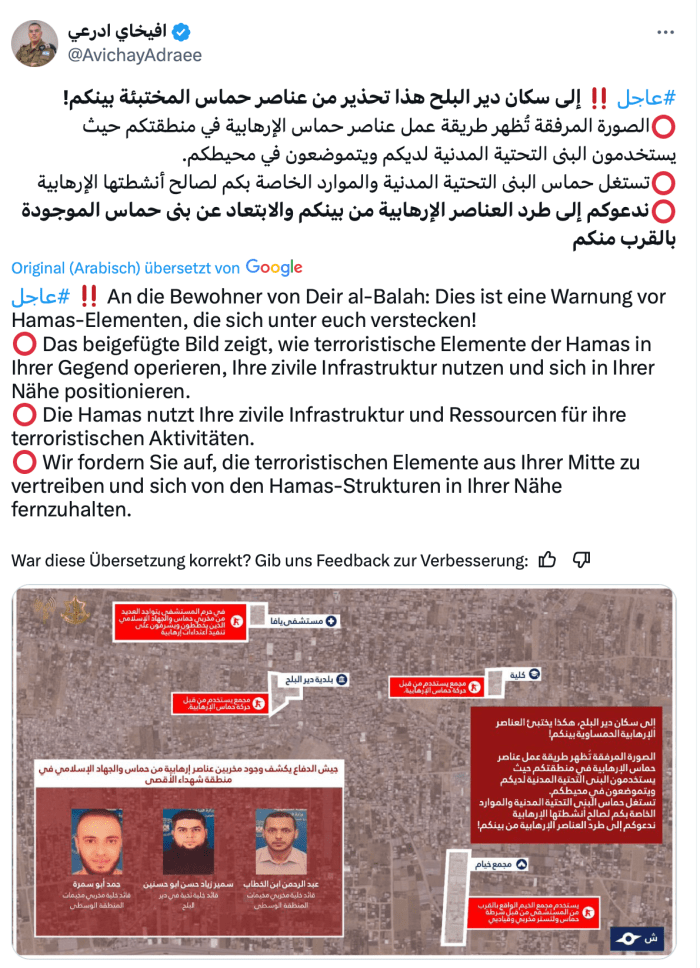 In einer bisher noch nicht da gewesenen Art warnt die IDF die gazanische Zivilbevölkerung im Gebiet von Deir al-Balah dringend auf, sich von konkret genannten Gegenden fernzuhalten. Drei mit Bild und Namen bekannt gemachte Hamas-Terroristen verstecken sich dort hinter der Zivilbevölkerung und greifen von dort aus die IDF an. Konkret handelt es sich um ein Verwaltungsgebäude, eine Schule, ein Krankenhaus und eine Zeltstadt. Menschliche Schutzschilde sind ein Standard der Hamas.