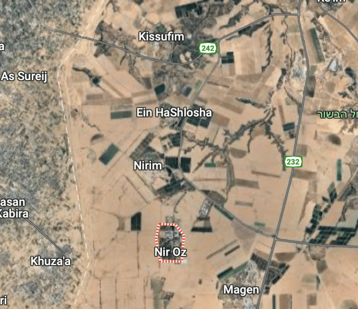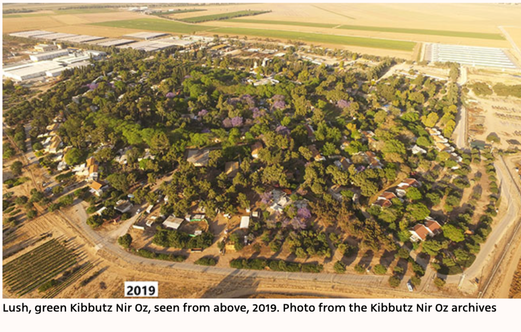 Der Kibbuz Nir Oz wurde im Jahr 1955 in unmittelbarer Nähe zum Gazastreifen errichtet. 2015 wurde er privatisiert. Er ist ein säkularer Kibbuz, der hauptsächlich landwirtschaftlich ausgerichtet ist. Ein besonderes Augenmerk liegt auf der Spargelzucht. Allerdings findet man den Spargel kaum in israelischen Läden, die 1.000 t, die im Jahr 2020 geerntet wurden, werden hauptsächlich ins Ausland exportiert. Es gibt auch eine Fabrik, die Farben und Abdichtungsmaterialien produziert und börsennotiert ist.