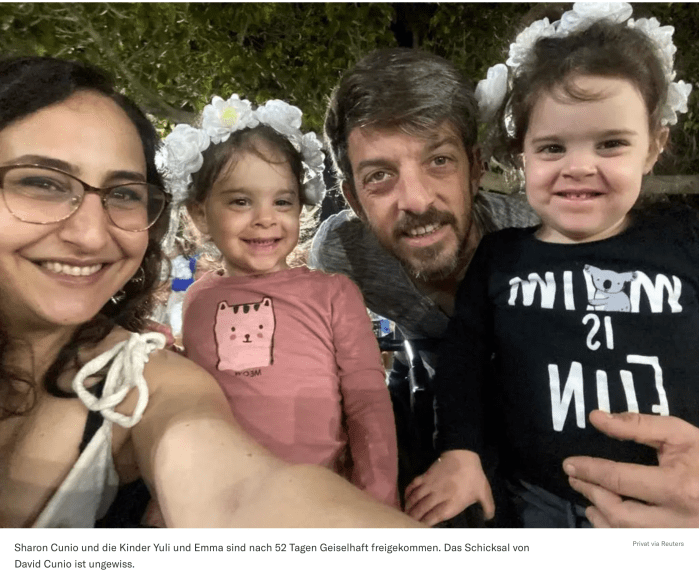 Sagui Dekel-Chen hatte sich als einer der ersten dem Sicherheitsteams des Kibbuz angeschlossen. Seine hochschwangere Frau Avital und zwei kleine Kinder überlebten das Massaker im Schutzraum ihres Hauses. Sein jüngstes Kind lernte er erst nach seiner Freilassung im Februar 2025 kennen, es war im Dezember 2023 zur Welt gekommen. Hier gibt es eine englische Version!