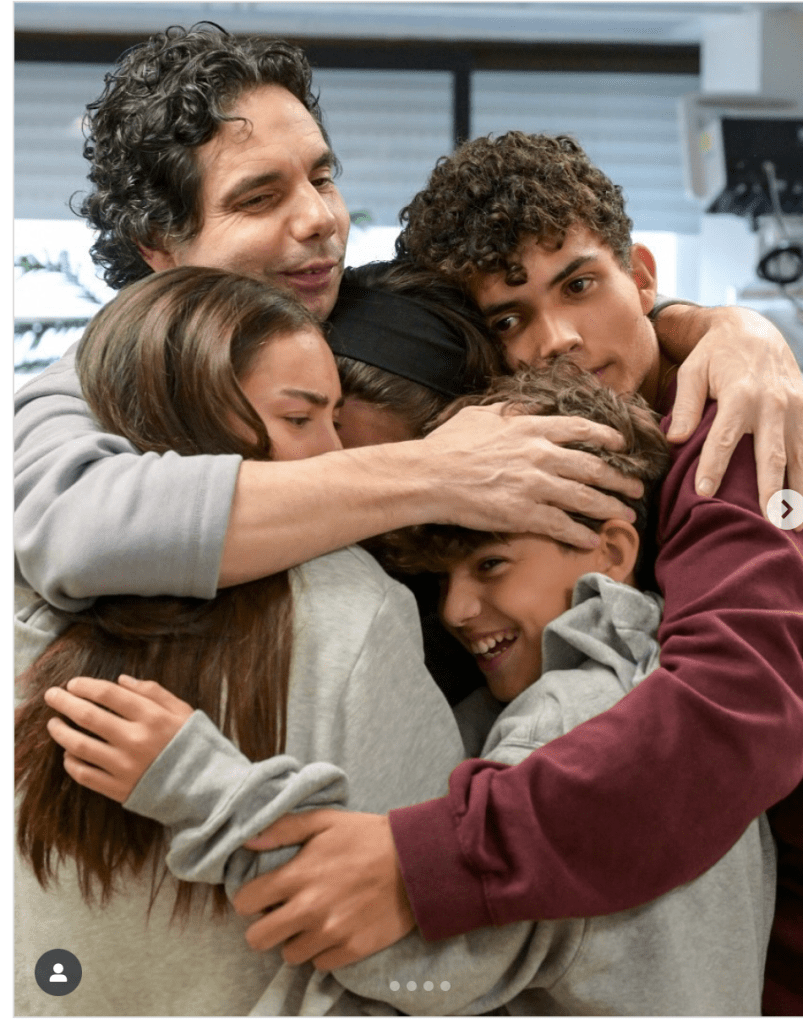 Arbel wurde von Eitan und Lucas Cunio auf den Platz der Geiseln begleitet. Die zwei sind Brüder von Ariel und David. David war mit seiner Frau Sharon und den Zwillingen Yuli und Emma verschleppt worden. Sharon und die beiden Mädchen wurden im November 2023 freigelassen.