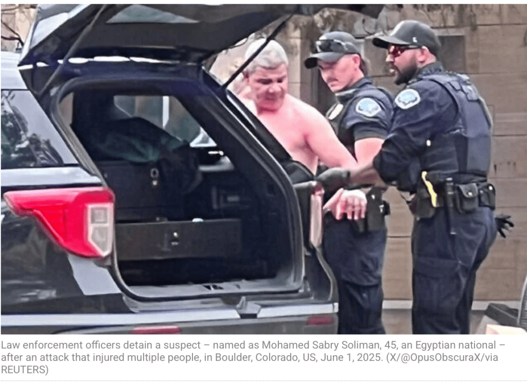 Nach der pro-palästinensisch begründeten Ermordung der zwei Botschaftsmitarbeiter Yaron Lischinsky und Sarah Lynn Milgrim, s’’l, in Washington am 23. Mai 2025 wurden gestern Abend bei einem Terroranschlag in Boulder, Colorado, mindestens acht Personen teilweise schwer verletzt. Der Terrorist, der Ägypter Mohamed Sabry Soliman, warf eine Brandbombe mit einem improvisierten Flammenwerfer auf eine Gruppe von Demonstranten. Die Demonstration der Gruppe ‘Run for their lives’ findet jeden Sonntag an einem anderen Ort in den USA statt.