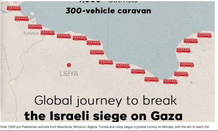 Über 7.000 pro-palästinensische Aktivisten sind mit mehr als 300 Fahrzeugen am Montag von Tunis losgefahren. Ihr Ziel ist es, auf dem Landweg Rafah zu erreichen und auf diese Art eine Hilfslieferung nach Gaza zu bringen und einen ‘humanitären Korridor’ zu öffnen. Der Konvoi wird begleitet von Ärzten, Studenten, Rechtsanwälten und ‘normalen Menschen’. Ein zweiter Konvoi mit 2.500 Teilnehmern wird am 15. Juni in al- Arish starten. Die Teilnehmer beider Konvois werden sich vom 15. bis 19. Juni in Rafah aufhalten. In der Zeit ist geplant, sich mit ägyptischen Beamten, Mitglieder von NGOs, Diplomaten und anderen zu treffen. Ägypten hat mittlerweile mitgeteilt, den Konvoi blockieren zu wollen.