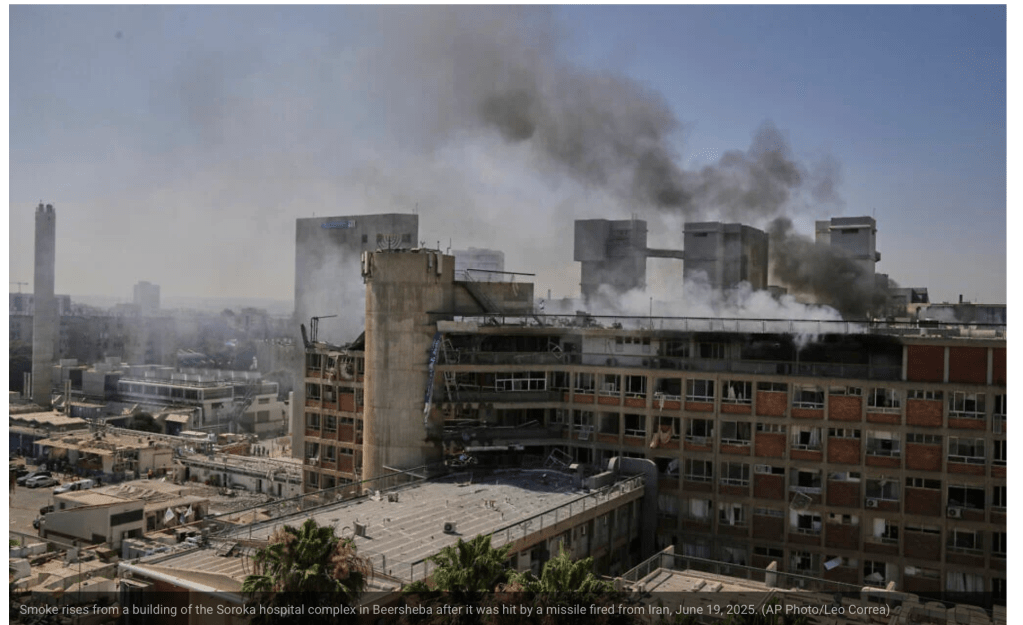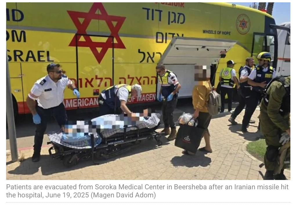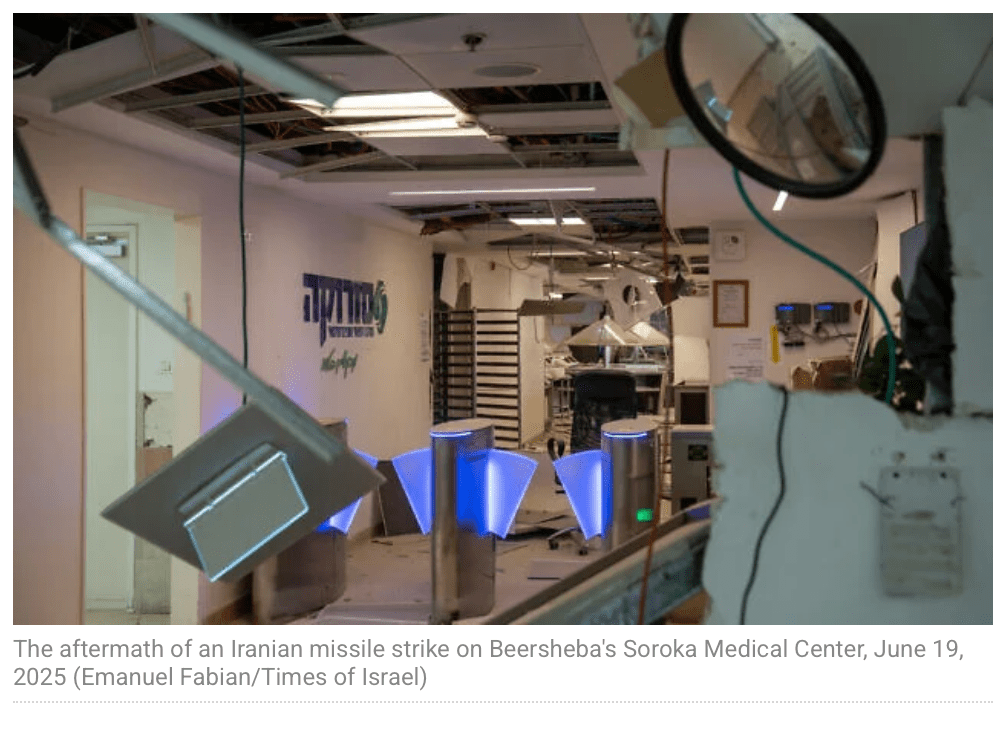 Das Soroka Krankenhaus in Beer Sheba wurde in weiten Teilen durch die iranischen Angriffe in der Nacht stark zerstört. Der alte Operationsbereich wurde direkt getroffen. Das Gebäude war bereits vor Tagen völlig evakuiert worden. Auch andere Flügel des Spitals wurden in Mitleidenschaft gezogen. Der Chef des Krankenhauses, Prof. Shlomi Kodesh erklärte, dass sich sämtliche Patienten und Mitarbeiter seit Tagen in den unterirdischen und gesicherten Räumen aufhalten. Die Iranische Revolutions Garde hat erklärt, der Beschuss hätte nicht dem Spital, sondern der ‘benachbarten Militärbasis’ gegolten. Diese Basis ist allerdings erst im Aufbau und zwei Kilometer entfernt. Iranische Behauptungen, dass das Spital militärischen Zwecken dient, bezeichnet die IDF als ‘falsch’.