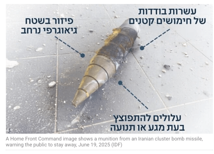Das ‘Home Front Command’ der IDF teilte mit, dass der Iran heute mindestens eine Langstreckenrakete mit einem Streubombenkopf auf Zentralisrael abgefeuert hat. Der Bombenkopf öffnet sich während des Sinkflugs der Rakete in einer Höhe von 7 km und wirft dabei etwa 20 kleinere, ungesteuerte Raketen ab. In Azor, in der Umgebung von Tel Aviv, schlug eine solche kleine Rakete in ein Haus ein und richtete dort einige Schäden an. Es wird dringend gewarnt, sich den Raketen zu nähern, wenn sie auf offenem Gelände abstürzen. Es besteht die Gefahr einer spontanen Explosion.