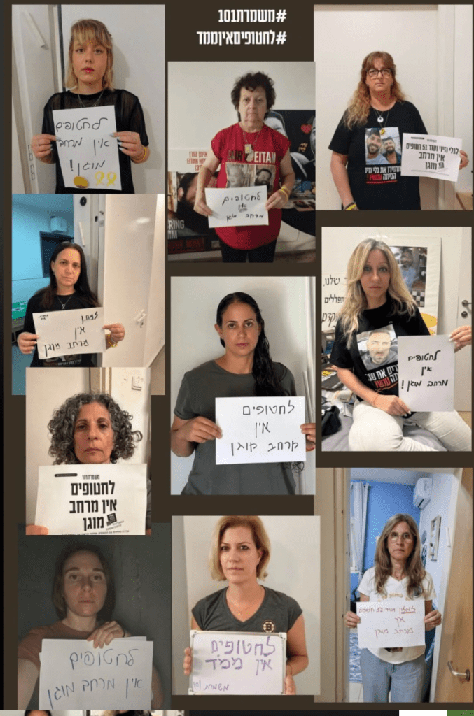 In einer Foto-Kollage machen Familienangehörige darauf aufmerksam, dass die noch in Gaza befindlichen Geiseln keinen Bunker haben. Die Kollage wurde von der Gruppe ‘Shift 101’ gestaltet, deren Ziel es ist, auch zu Kriegszeiten wie jetzt die Geiseln nicht aus der öffentlichen Aufmerksamkeit zu verdrängen.