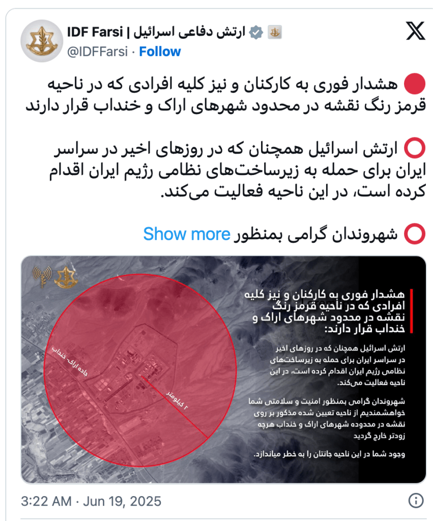 Am frühen Nachmittag hat die IAF einen ‘Schwer-Wasser-Reaktor’ in Arak zerstört. Der Reaktor befand sich noch im Bau und sollte, entsprechend einer Information an die IAEA, im kommenden Jahr ans Netz gehen. Zuvor hatte die IDF eine dringende Evakuierungsaufforderung an die Einwohner des Gebietes um Arak ausgegeben.