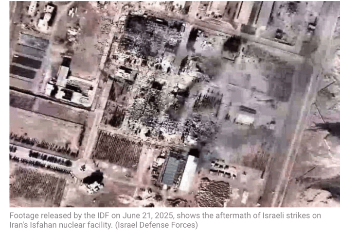 Die IDF hat heute Bilder veröffentlicht, die das Ausmass der Zerstörung am Atomkraftwerk Isfahan zeigen. Zahlreiche wichtige Gebäude, darunter Labors oder Gebäude zur Uran-Umwandlung wurden völlig zerstört, andere Gebäude erlitten massive Schäden. Die UN-Atomenergiebehörde bestätigte, dass eine Fabrik zur Herstellung von Zentrifugen in der iranischen Nuklearanlage Isfahan beim jüngsten Angriff im Rahmen der israelischen Bombenkampagne getroffen wurde. «Dies ist die dritte derartige Einrichtung, die in der vergangenen Woche bei den israelischen Angriffen auf iranische Atomanlagen getroffen wurde. Wir kennen diese Anlage gut. Es gab kein Nuklearmaterial in dieser Anlage, und daher wird der Angriff auf sie keine radiologischen Folgen haben», wird Grossi, der Leiter der Abteilung zitiert.