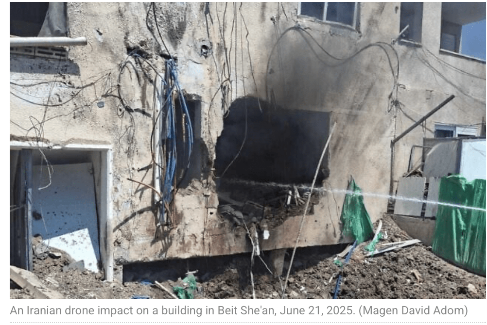 In der vergangenen Nacht hat Israel 40 Drohnen, die aus dem Iran auf Israel abgeschossen wurden, abgefangen und zerstört. Eine Drohne konnte nicht abgefangen werden und schlug in ein Haus in Beit She’an ein. Das Haus wurde stark beschädigt. Es gab keine Meldungen über Verletzte. Eine zweite Drohne schlug unmittelbar neben einer Schnellstrasse im Süden ein.