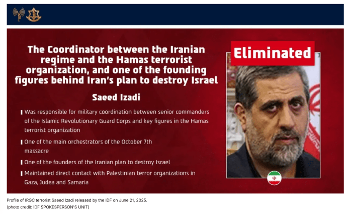Saaed Izadi, Leiter der palästinensischen Abteilung der ‘Quds Force’ wurde bei einem gezielten nächtlichen Angriff in der iranische Stadt Qom eliminiert. Sein Aufenthaltsort war von den israelischen Geheimdiensten ausgeforscht worden. «Izadi ermöglichte die finanzielle Unterstützung der Hamas durch den Iran für terroristische Aktivitäten gegen den Staat Israel und unterhielt direkte Kontakte zu palästinensischen Terrororganisationen sowohl im Gazastreifen als auch im Westjordanland», teilte ein Sprecher der IDF mit. Izadi galt auch als einer der führenden Köpfe bei der Planung des Massakers vom 7. Oktober. «Während des Krieges war er für die Führung der Hamas-Kräfte im Libanon verantwortlich. Er machte es sich zur Aufgabe, den militärischen Flügel der Hamas wieder aufzubauen und sicherzustellen, dass die Gruppe die herrschende Macht in Gaza bleibt.»