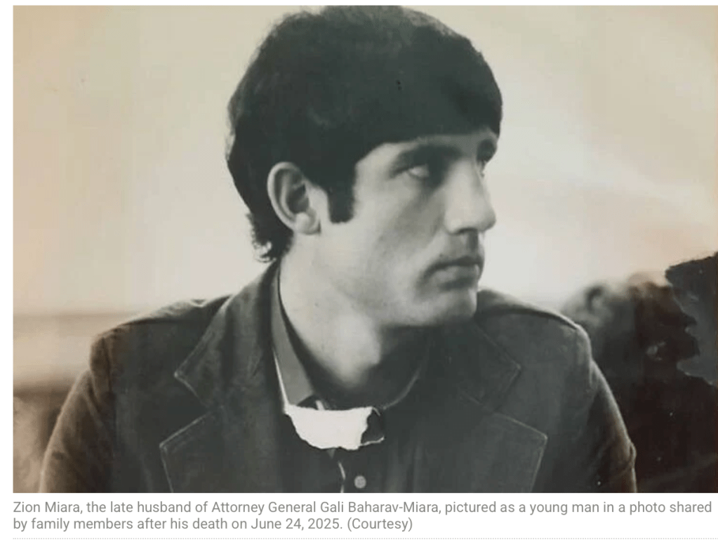 Der Ehemann von GStA Gali Baharav-Miara, Zion Miara, 69, s’’l, der seit Jahren an ALS (Amyotrophe Lateralsklerose), einer unheilbaren Erkrankung des Nervensystems litt, ist heute gestorben. Zion Miara arbeitete jahrelang im Shin Bet, bevor er krankheitsbedingt seine Arbeit aufgeben musste. ברוך דײַן האמת