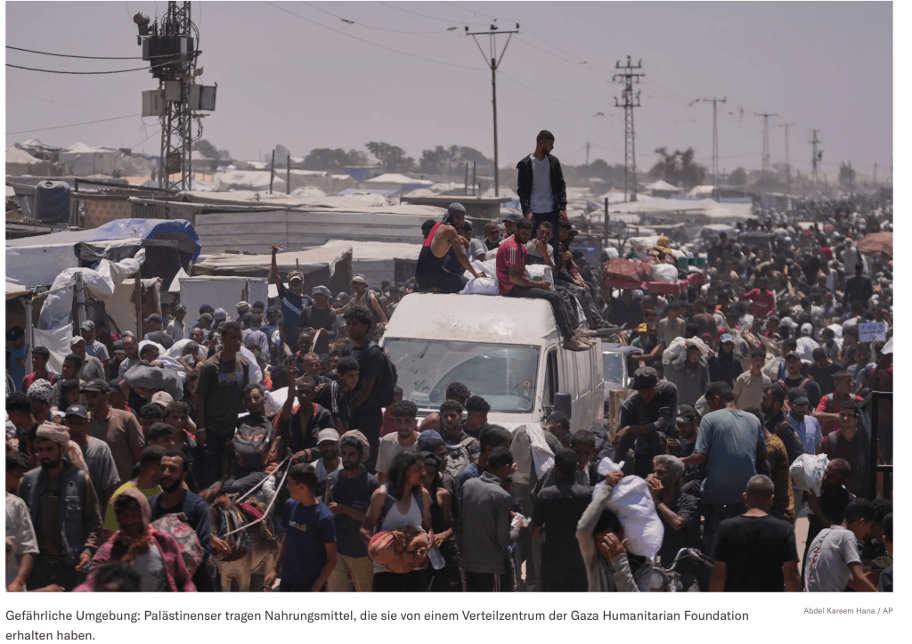 UN-Generalsekretär Antonio Guterres lehnt es grundsätzlich ab, dass die UNO gemeinsam mit der GFH für die Lebensmittelverteilung in Gaza verantwortlich ist. Deren Vorgangsweise sei nicht neutral, weil sie ausschliesslich von den USA unterstützt wird. Darüber hinaus trage die Militarisierung [durch die Kontrolle der Zugangswege zu den Verteiler-Zentren] nicht zur Sicherheit der Verteilung bei. Guterres beklagte auch, dass es immer wieder zu Schiessereien kommt, die Menschenleben fordern. Israel als Besatzungsmacht sei verpflichtet, Hilfslieferungen in und durch das palästinensische Gebiet zu genehmigen und zu erleichtern. Die GFH reagiert wie erwartet: «Unter dem Strich wird unsere Hilfe sicher geliefert. Anstatt von der Seitenlinie aus zu streiten und Beleidigungen auszustossen, würden wir es begrüssen, wenn die UNO und andere humanitäre Organisationen sich uns anschliessen und die Menschen in Gaza mit Lebensmitteln versorgen würden.» Auf ihrer eigenen Webseite behauptet GHF, bis zum 22. Juni pro Tag mehr als eine Million Mahlzeiten in Paketen zu jeweils 57.75 kg ausgegeben zu haben. Insgesamt sollen es mittlerweile mehr als 48 Millionen Mahlzeiten sein, die in 34 Tagen ausgeliefert wurden. Ein Ding der Unmöglichkeit!