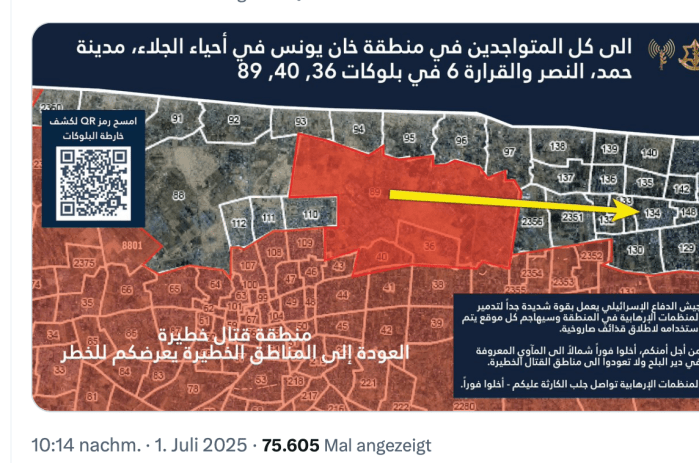 Gestern am frühen Abend wurden erneut zwei Raketen aus dem südlichen Gazastreifen auf Israel abgeschossen. Beide wurden von der IAF abgefangen und zerstört. Kurz darauf erfolgte ein Evakuierungsbefehl für weite Teile von Khan Younis. Die IDF gab bekannt, dass in der evakuierten Zone umfangreiche militärische Aktivitäten vorgenommen werden und das Gebiet daher eine gefährliche Kampfzone ist.