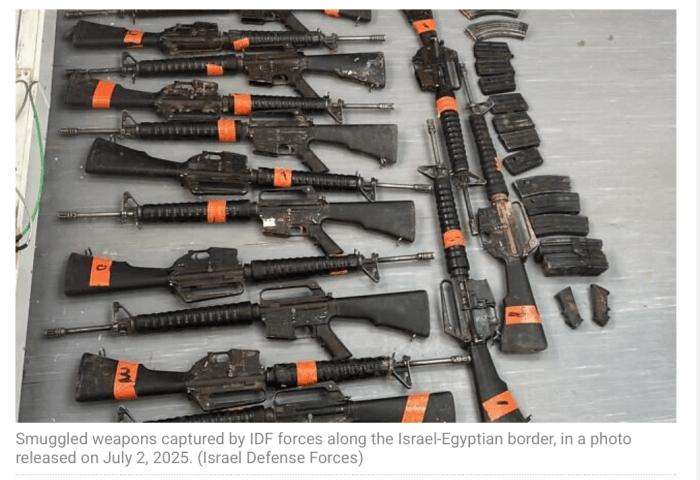 Zwei Versuche, Waffen über die ägyptische Grenze nach Israel zu schmuggeln, wurden erfolgreich vereitelt. Der erste Versuch wurde mit einer Drohne durchgeführt, die 10 Gewehre transportierte, der zweite mit einem auffälligen Fahrzeug, das in der Nähe der Grenze fuhr. 14 Gewehre wurden beschlagnahmt, der Fahrer wurde festgenommen.