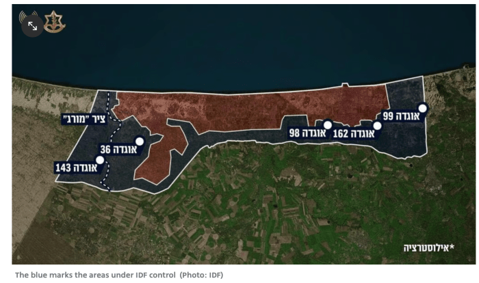 Netanyahu fordert daraufhin, ihm einen umfassenden Plan vorzulegen, wie die komplette Zivilbevölkerung in den Süden des Gazastreifens evakuiert werden kann. Smotrich drängte darauf, den Norden des Gazastreifens zu belagern, um wie er hofft, die Vorherrschaft der Hamas zu brechen. Zamir lehnt den Vorschlag vehement ab und erklärt, dass die Militärherrschaft über zwei Millionen Palästinenser leicht ausser Kontrolle geraten könne. «Ich will keine Militärverwaltung», soll Netanyahu gesagt haben, «aber ich will die Gazaner in ein grosses ziviles Gebiet umsiedeln. Ich werde nicht zulassen, dass die Hamas in irgendeiner Form in Gaza bleibt. Die Alternative wäre, den Gazastreifen zu überrennen und die Geiseln zu opfern – und das werde ich auch nicht zulassen.» Die IDF beherrscht derzeit 65 % der Gesamtfläche von Gaza.