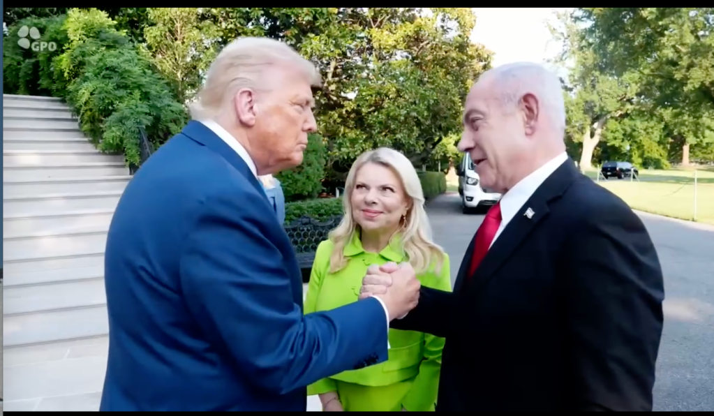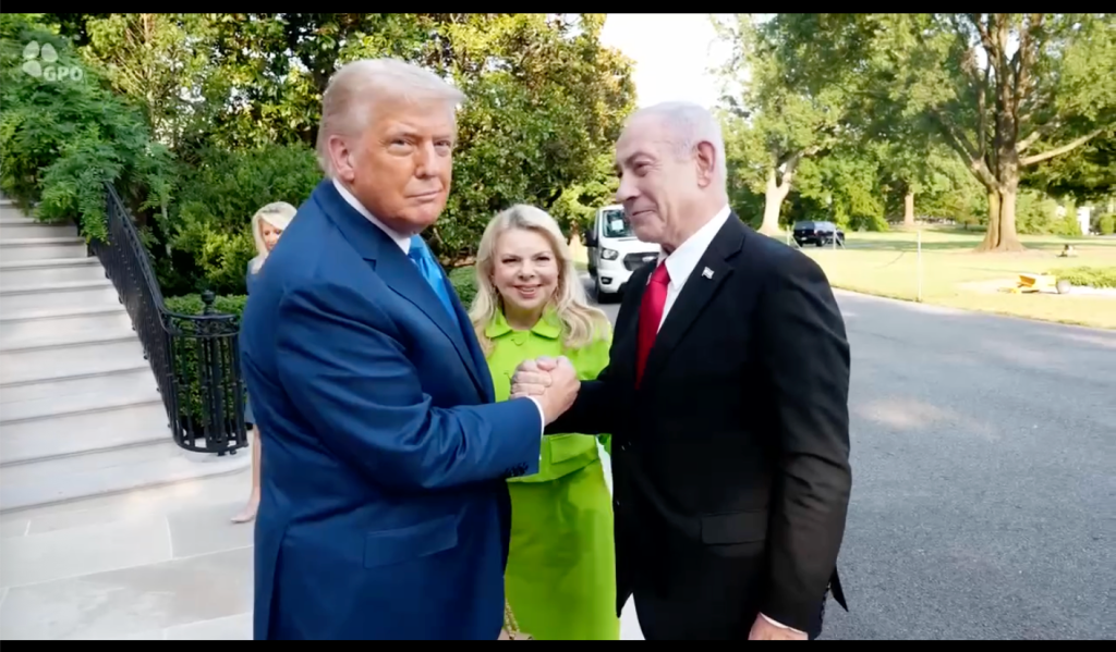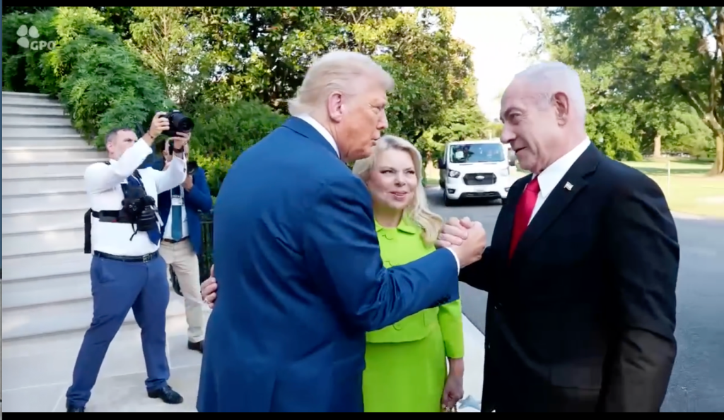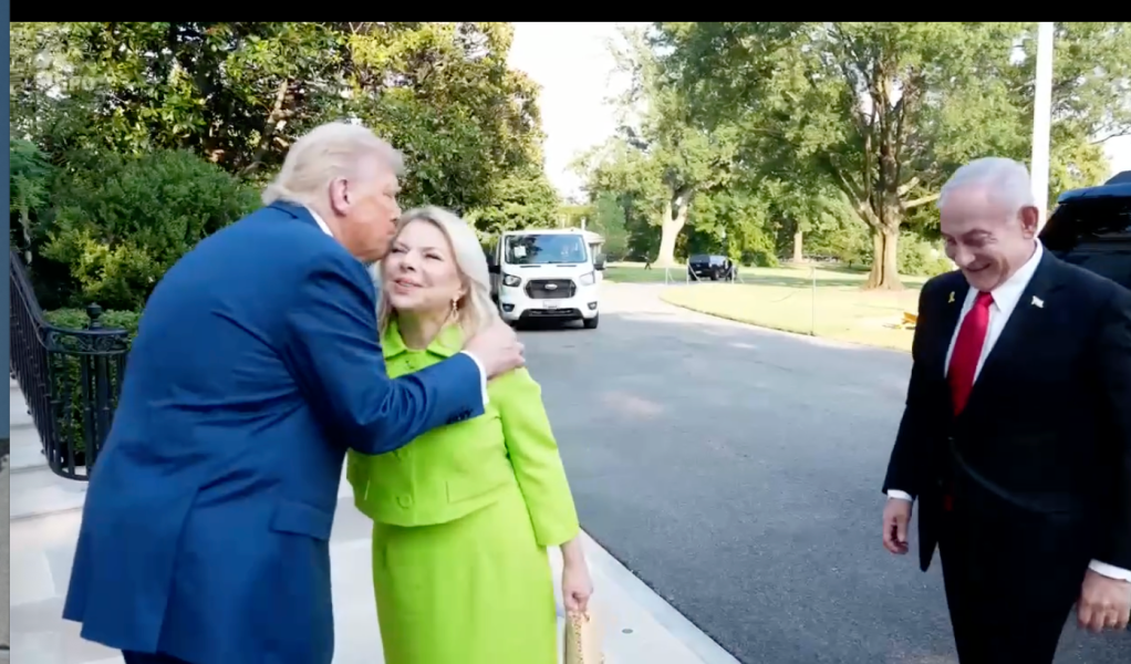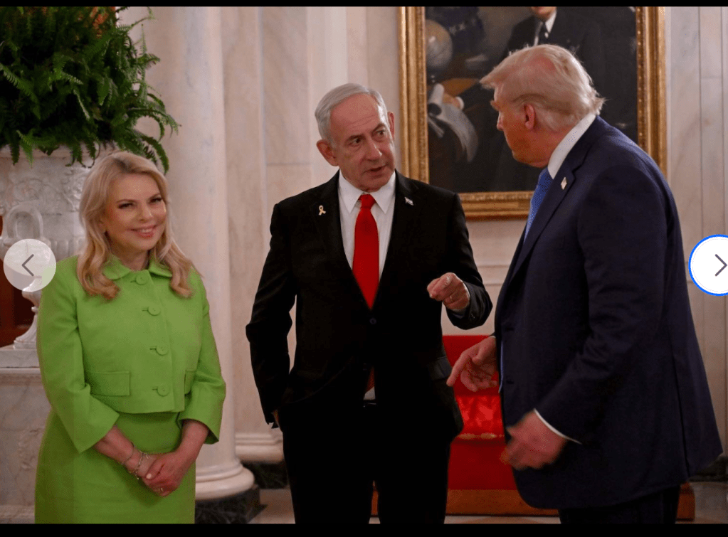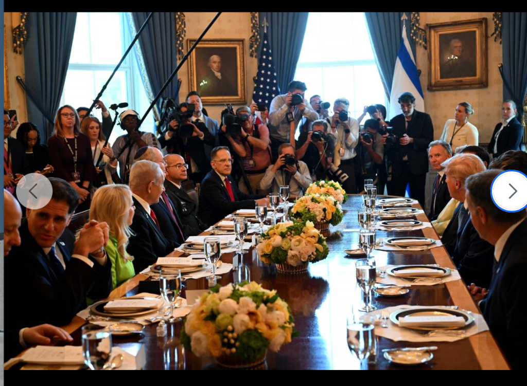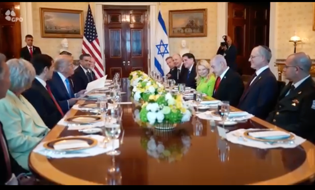 Beim gemeinsamen Abendessen im ‘Blauen Salon’ des ‘Weissen Hauses’ war Erstaunliches zu beobachten. Was als kleines gemeinsames Essen angekündigt war, entpuppte sich als mehrfache Inszenierung der besonderen Art. 15 Männer und zwei Frauen sitzen am festlich gedeckten Tisch. Die Frau rechts neben Marco Rubio ist unbekannt. Die zweite ist…… Sara N., gekleidet in Giftgrün. Erwartungsvolles Schweigen. Dann erhebt sich Netanyahu und überreicht Trump ein Dokument.