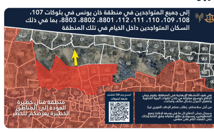 Die sogenannten ‘humanitären Zonen’, in die sich Gazaner immer wieder evakuieren müssen, werden immer enger. Aufgrund von terroristischen Aktivitäten in Khan Younis wurde heute erneut ein Evakuierungsbefehl für weite Teile der Stadt ausgegeben.