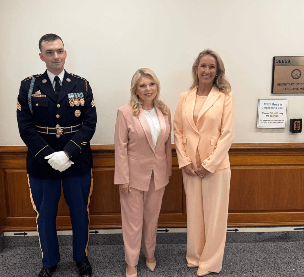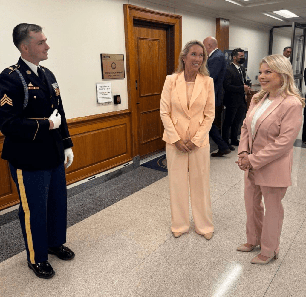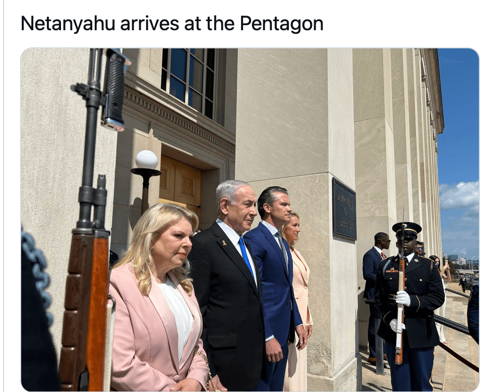 Netanyahu konferierte während seines Besuches im Pentagon mit US-VM Pete Hegseth über den Iran und die regionale Sicherheits-Zusammenarbeit sowie die strategischen Beziehungen zwischen Israel und den USA. Sarah N., die über keinerlei Funktionen in Israel verfügt, nahm auch an diesem Programmpunkt des USA-Aufenthaltes teil. Jennifer, die Ehefrau von Hegseth, übernahm es, das ‘Damenprogramm’ für Sara N. durchzuführen und nahm sie auf eine Tour durch das Pentagon mit. Die beiden Damen trugen rosa Hosenanzüge. Die eine mehr im Farbton Lachs- die andere im Farbton Piggy-Rosa.