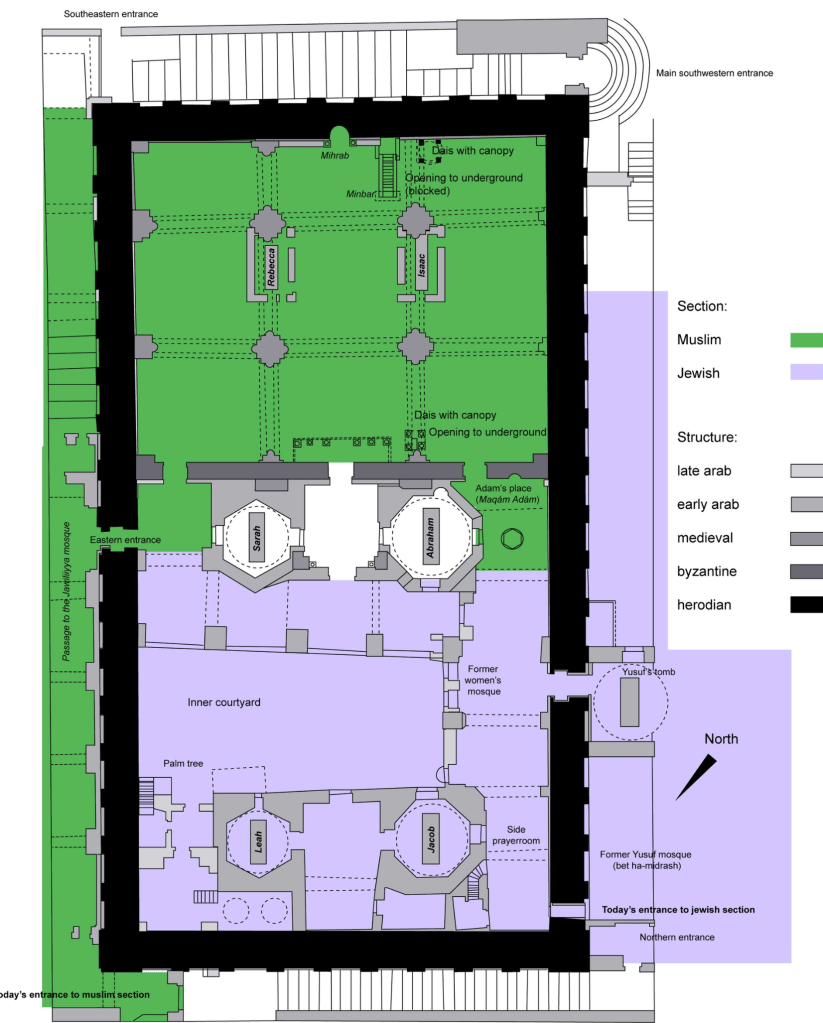 [1] ‘Das Grab der Patriarchen’ lag ursprünglich in der Höhle Machpela, im heutigen Hebron. Im ersten Buch der Torah, Bereshit 23:9 ff, erfahren wir, dass Avram diese Höhle für das Grab seiner Frau Sara gekauft hat. In der Höhle, die heute Teil einer von Herodes gebauten Festung ist, liegen die Gräber von Avram und Sara, Isaac und Rivka, sowie Ja’acov und Lea.