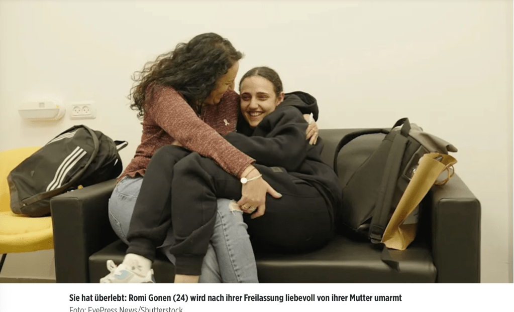 Die gute Nachricht des Tages: Romi Gonen, 25, die am 7. Oktober 2023 während des Massakers schwer verletzt und anschliessend nach Gaza verschleppt wurde, durfte heute das Krankenhaus verlassen. Während der Zeit in Gaza erhielt sie keinerlei Medikation, noch sonst eine Behandlung. Nach 471 kam sie im Januar endlich frei. Seither hat sie zwei schwere Operationen hinter sich gebracht, eine dritte wird in wenigen Wochen folgen. Bis dahin wird sie sich zu Hause erholen und wie sie sagt, endlich ihre Freiheit geniessen.