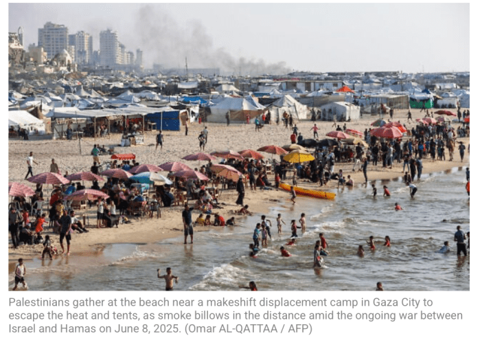 Seit dem 7. Oktober 2023 ist den Palästinensern entlang des ganzen Küstenstreifens verboten, den Zugang zum Meer zu nutzen. Dass dieses Verbot offenbar kaum eingehalten wird, zeigt das Bild. Bei Temperaturen, die täglich über 30° liegen und die in den beengten Zelten der Auffanglager noch spürbarer wird, ist es kein Wunder, dass die schmalen, noch nicht zugestellten Strände überfüllt sind. Der arabisch-sprechende IDF-Sprecher Avichay Adraee warnte: «Die IDF wird auf jeden Verstoss gegen diese Beschränkungen reagieren. Wir fordern Fischer, Schwimmer und Taucher dringend auf, nicht ins Meer zu gehen. Das Betreten des Meeres entlang des Gazastreifens setzt Sie einer Gefahr aus.» Bisher werden allerdings nur Massnahmen bei jenen Wasserratten durchgeführt, die sich weiter hinaus in tiefe Gewässer begeben. Wie die Massnahmen aussehen, wurde nicht konkretisiert.