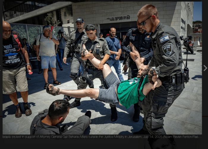 Während das ‘Gremium’ in den Räumen des Justizministeriums tagte, demonstrierten Unterstützer von GStA Gali Baharav-Miara vor dem Gebäude. Als sie versuchten, die Zugänge zum Haus zu blockieren, um sich selbst im Haus zu verbarrikadieren, wurden sie gewaltsam von der Polizei entfernt.
