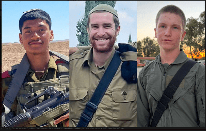 Auch heute musste die IDF leider den Tod von drei Soldaten bekanntgeben. Staff Sgt. Shoham Menahem, 21, Sgt. Shlomo Yakir Shrem, 20, und Sgt. Yuliy Faktor, 19, s’’l, starben durch die Explosion ihres Panzers. Zunächst war die IDF davon ausgegangen, dass der Panzer von einer Panzer-Abwehr-Rakete getroffen wurde. Nach eingehenden Untersuchungen wurde jedoch klar, dass die Explosion wahrscheinlich durch die Explosion einer eigenen Granate im Turm des Panzers ausgelöst wurde.